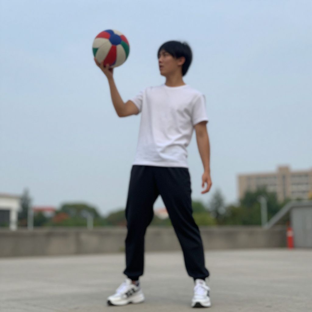 Photograph of an Asian man in a white t-shirt, black pants, and white sneakers, mid-dribble a colorful volleyball outdoors.