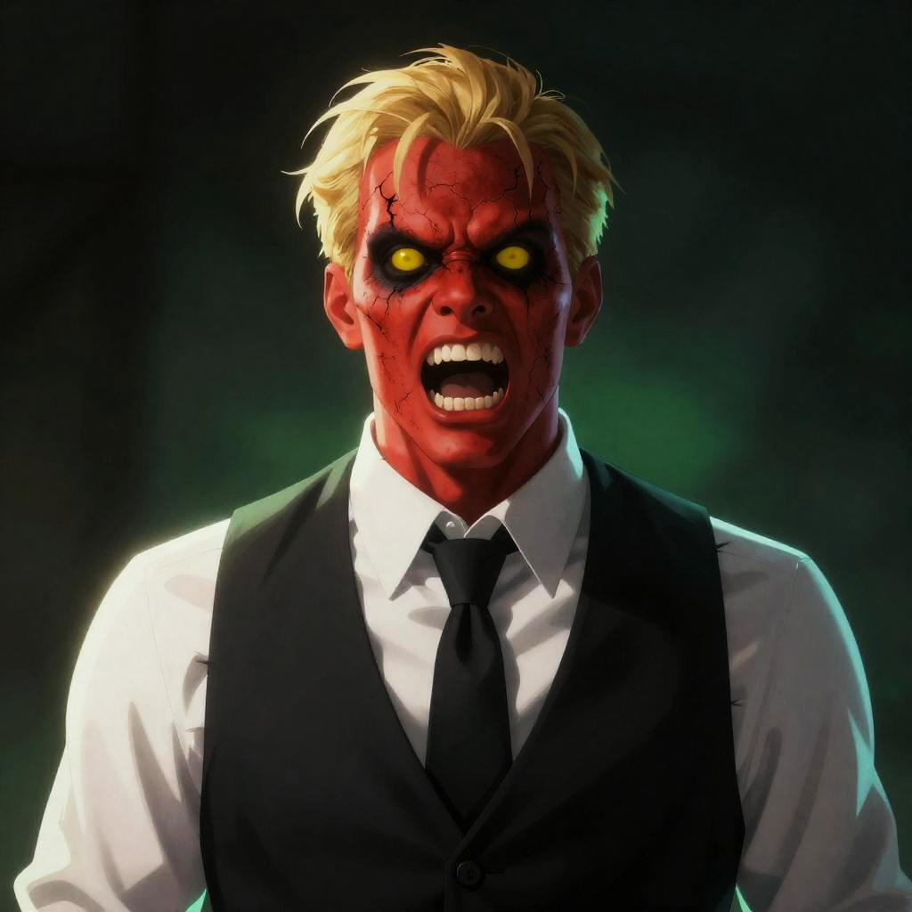 Digital illustration of a man with cracked, red skin and yellow eyes, mouth open in a scream. He wears a white shirt, black vest, and black tie. Background is dark with green glow. Man's hair is blonde, messy. Intense expression.