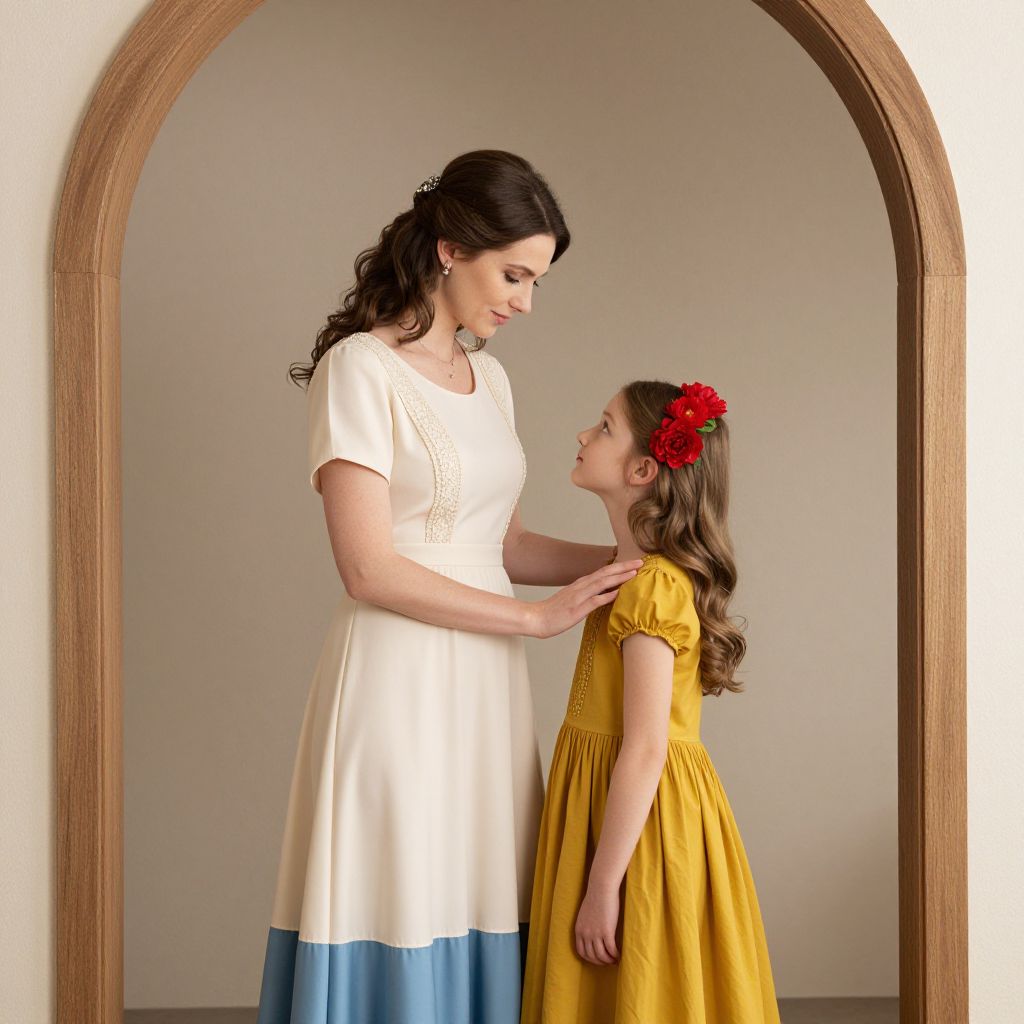 Elegant woman in a cream dress with a blue underskirt tenderly consoles a young girl in a mustard-yellow gown, both adorned with matching red floral hair accessories, as they stand together within an arched wooden frame.