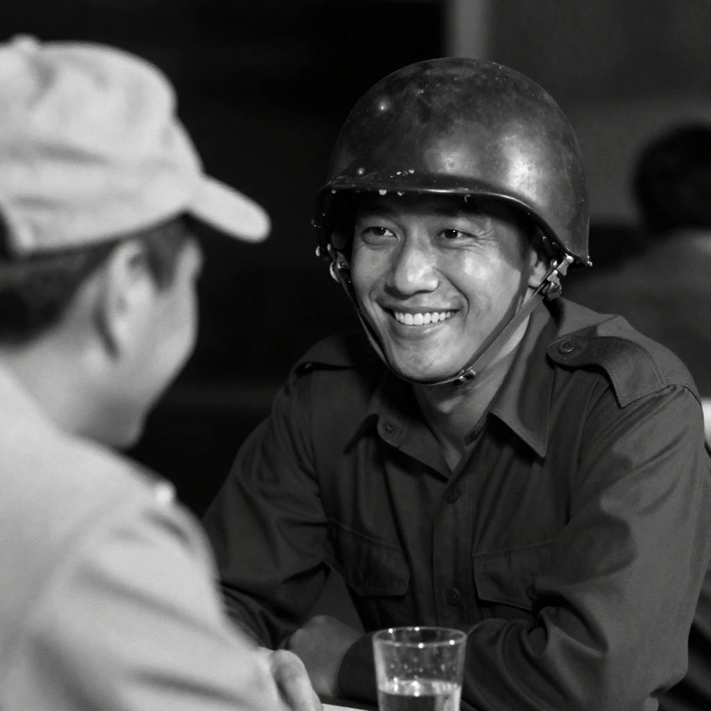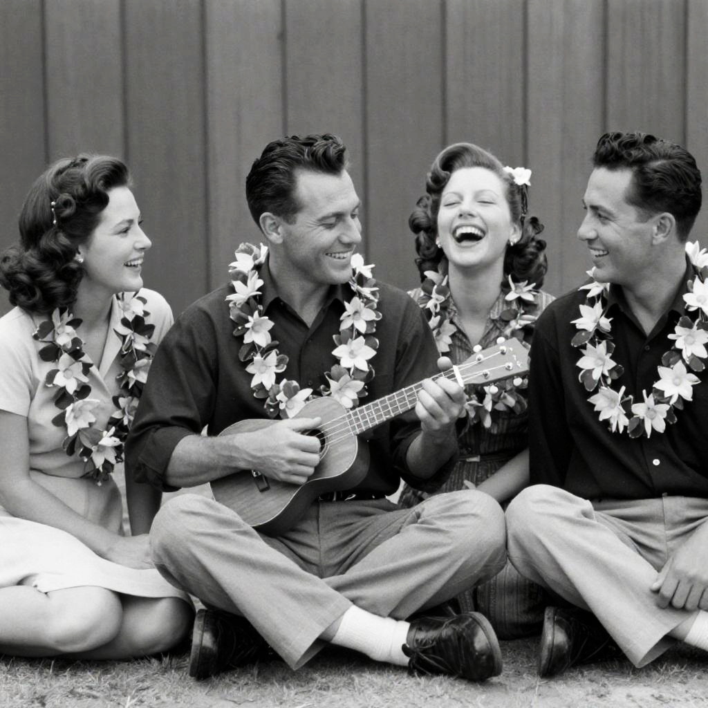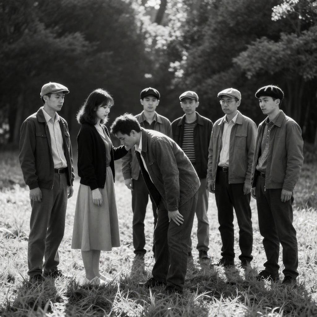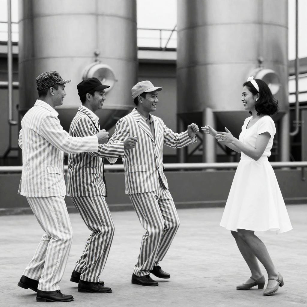 Black-and-white photograph featuring three Asian men in striped suits and caps smiling and dancing towards a woman in a white dress and headband. The woman is smiling and gesturing with her hands. The background shows large industrial tanks and pipes, suggesting an outdoor industrial setting.