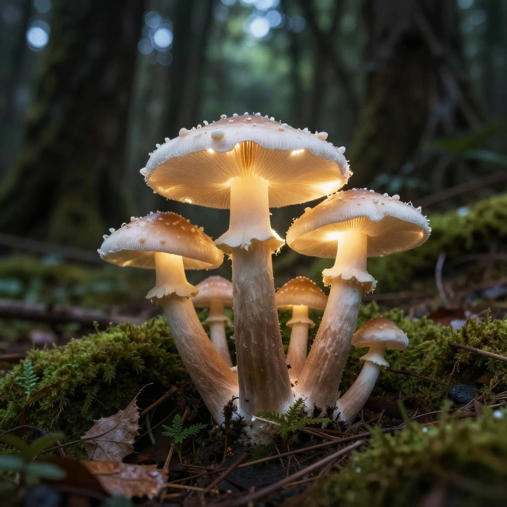 Agaric mushrooms growing in a mystical forest, with glowing caps and ethereal light filtering through ancient trees, moss-covered ground, a serene and enchanted atmosphere, high detail, fantasy art style