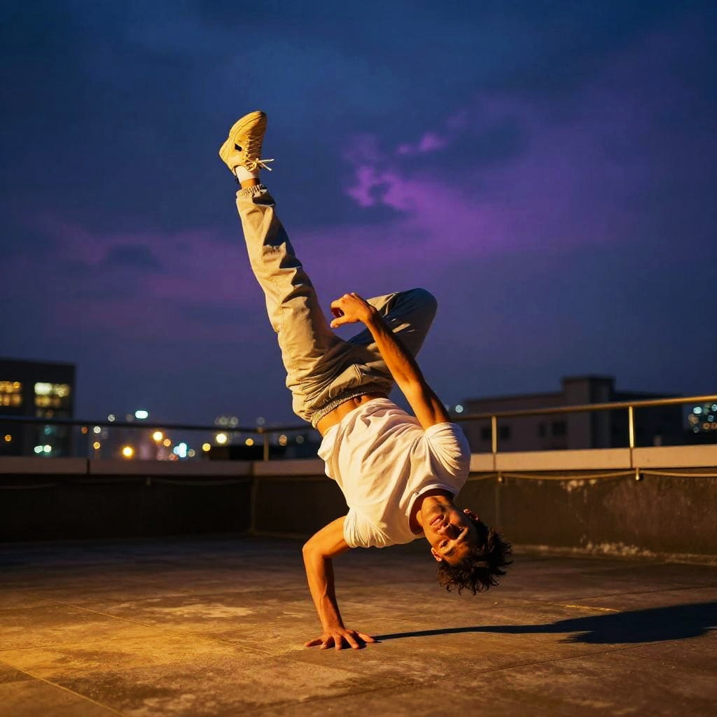 A street dancer performing breakdance move in a graffiti-covered urban plaza at night, rendered in neon-colored digital comic style, cinematic composition with shallow depth of field and atmospheric mood lighting.