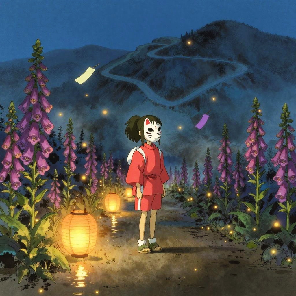 Spirited Away-inspired fantasy at a winding mountain trail bordered by glowing foxgloves; a teenage girl with a crimson haori and fox mask stands amid glowing lanterns and fluttering paper talismans. ink wash with fine digital details aesthetic with delicate linework, soft edges, and subtle washi texture. Cinematic composition with leading lines and a clear vanishing point, cool blue and muted gold grading, volumetric light, gentle fog, soft bokeh, polished wood reflections, high detail, subtle film grain, calm, wistful mood.