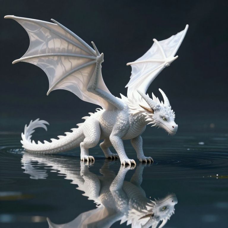 A serene 3D-rendered white dragon stands gracefully on a reflective water surface, its translucent wings casting intricate shadows as it gazes into its own mirrored reflection, evoking a sense of timeless wonder in a high-definition, fantasy-inspired scene.