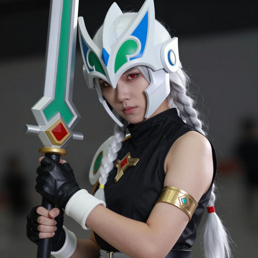 Portrait of a person with long blonde hair and striking blue eyes wearing a red and gold robe, holding a silver sword with a golden hilt raised above their head. The background features a bright red and orange gradient with radiating light beams, and a blue table is visible in the foreground. The subject exhibits an intense, focused gaze.