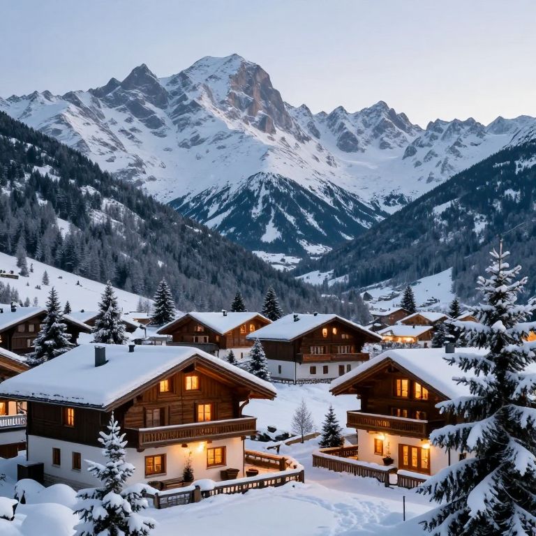 Snow-covered chalets stand majestically against a backdrop of towering alpine peaks, illuminated by warm interior lights and surrounded by evergreen trees blanketed in fresh snow, creating a serene winter retreat in Courmayeur, Aosta, Italy.