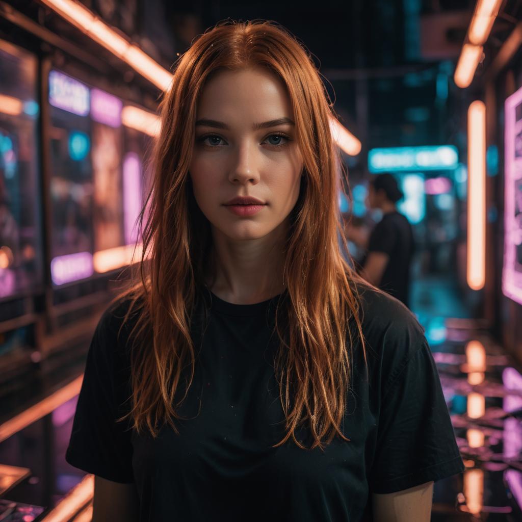 A half-body portrait with hands visible and props. The subject features bright copper-colored long hair with blunt ends. A calm, serene gaze is captured. The subject wears a simple fitted black t-shirt. The background is a neon-lit cyberpunk street with wet reflections. Natural daylight lighting, depth of field, photorealistic, 8k, highly detailed hair texture.