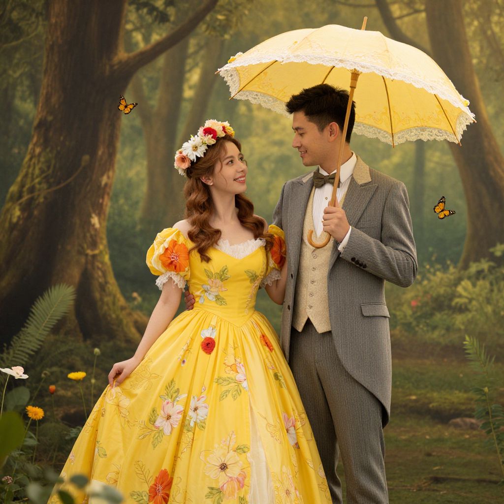 A fairy-tale inspired digital artwork featuring a couple in a whimsical forest setting, with the woman in a vibrant yellow floral dress adorned with a floral crown and the man in a formal suit holding a matching parasol, surrounded by butterflies and soft golden-hour lighting.