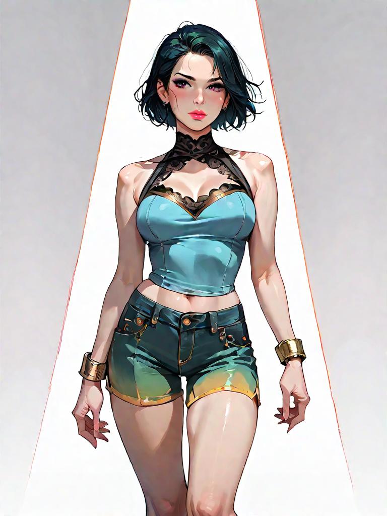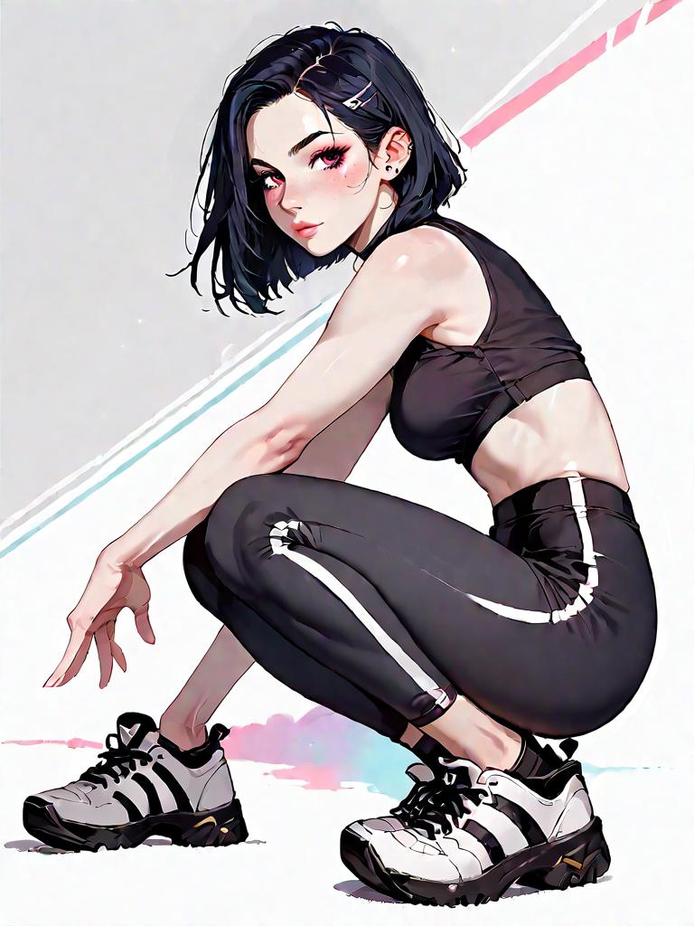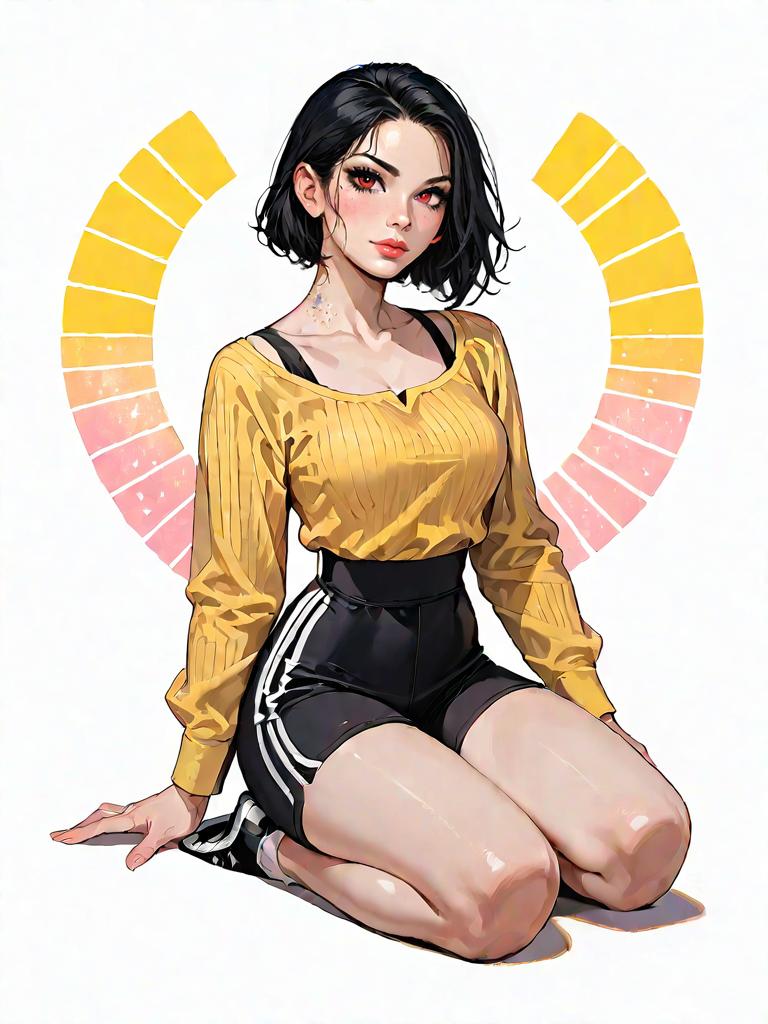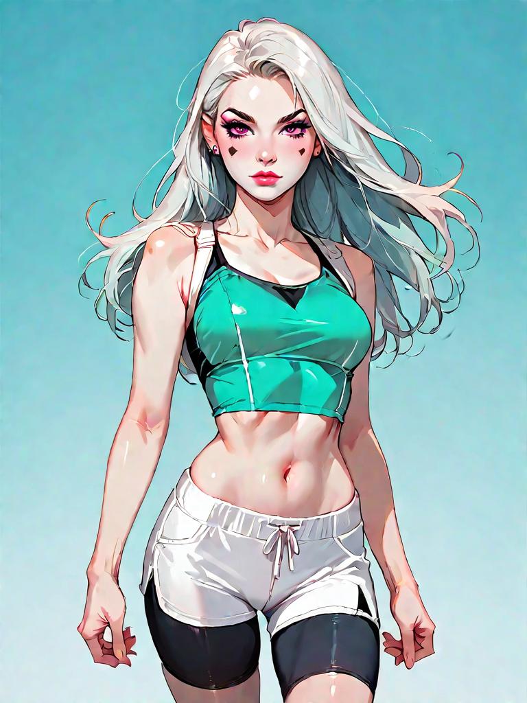 Digital illustration of a young athletic woman standing in front of a colorful circular abstract background. She is wearing an olive green sports bra with a scoop neckline and dual spaghetti straps, paired with matching high-waisted bike shorts that are mid-thigh length. The woman has short dark hair and a realistic facial expression, posed against a neutral indoor textured wall.