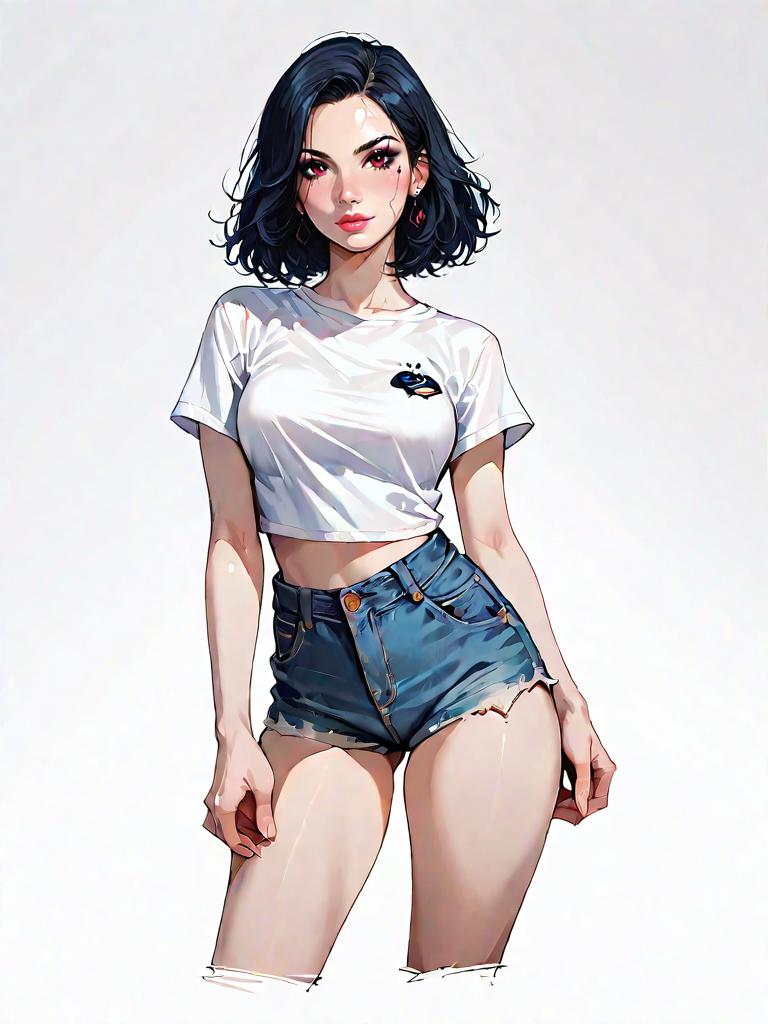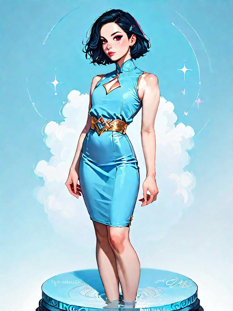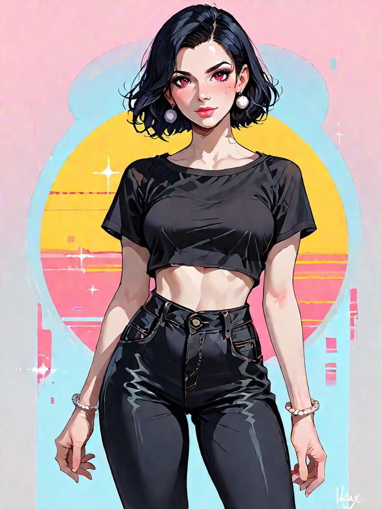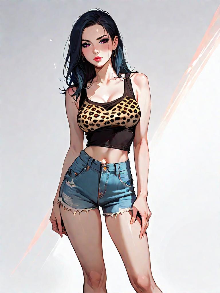 Digital illustration of a young athletic woman standing in front of a colorful circular abstract background. She is wearing an olive green sports bra with a scoop neckline and dual spaghetti straps, paired with matching high-waisted bike shorts that are mid-thigh length. The woman has short dark hair and a realistic facial expression, posed against a neutral indoor textured wall.