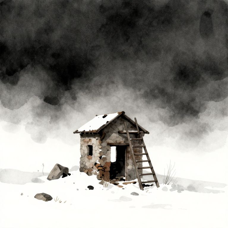 An abandoned mine in the mountains during a snowy, foggy day, with a dark sky and a minimalist watercolor style.