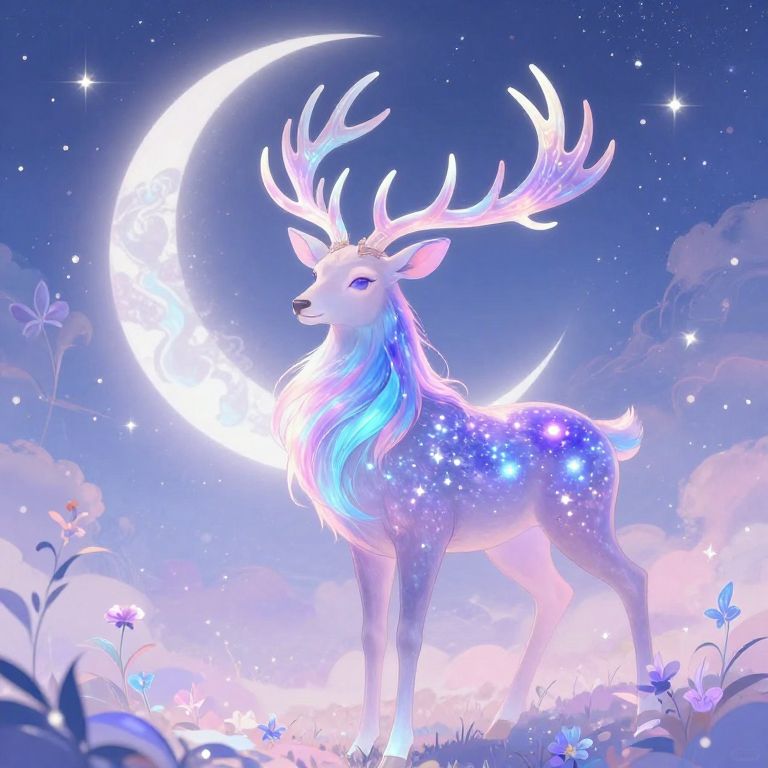 Digital illustration of a radiant, glowing white deer with blue and pink mane, large antlers, and starry spots, standing under a bright crescent