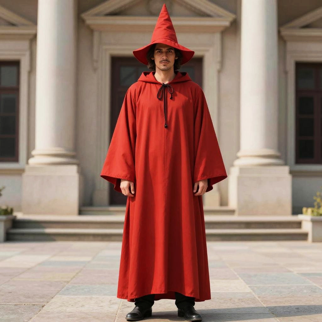Red Wizard Costume, man in red robe and hat standing in front of a building