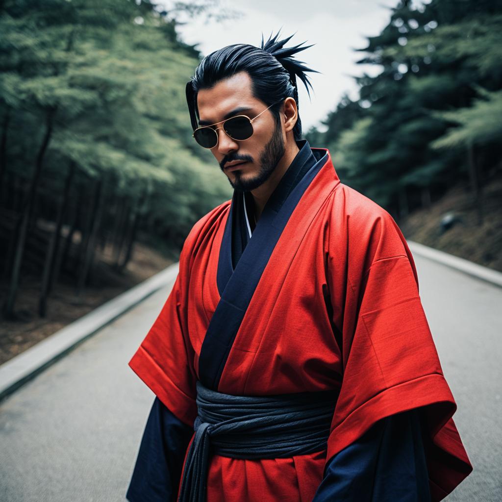 Auron, cosplay costume of man wearing dark sunglasses, red kimono-style clothing with wide sleeves and high collar
