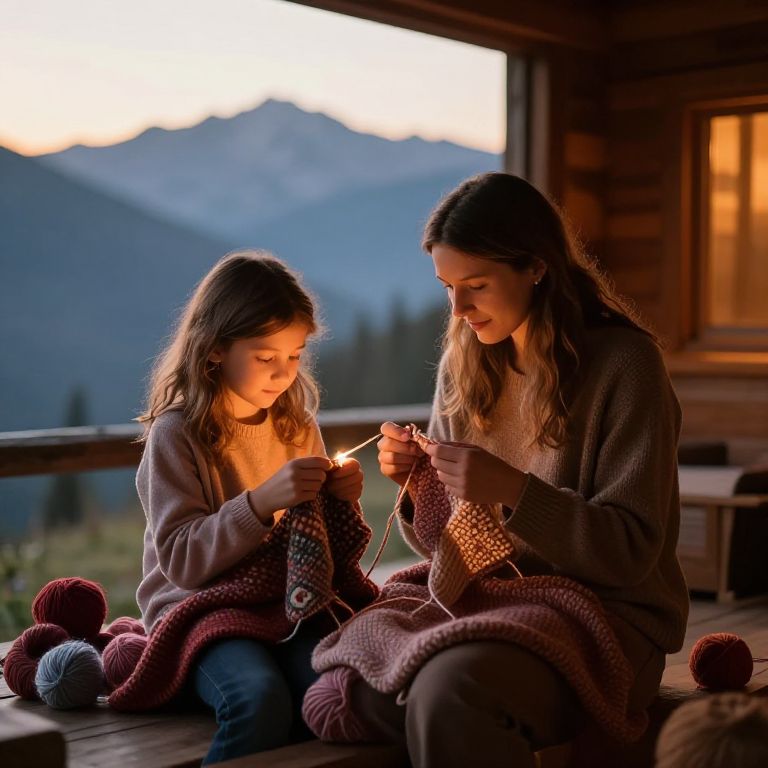 Photograph of a mother and daughter knitting together in a wooden cabin at sunset, with mountains in the background, warm light illuminating their faces.