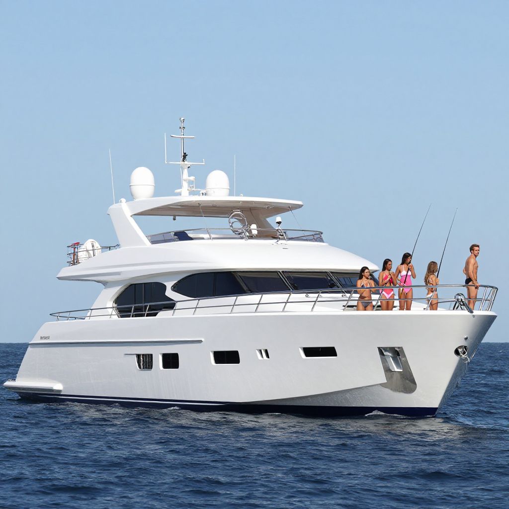 Diameter a very beautiful luxury yacht 18m long, president macron is fishing accompanied by several very beautiful women in swimsuits, photo realistic details, 8k,