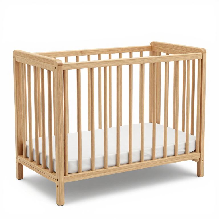Illustrator-rendered wooden baby crib featuring vertical slats and a sturdy frame, showcased against a clean white background with subtle shadowing.