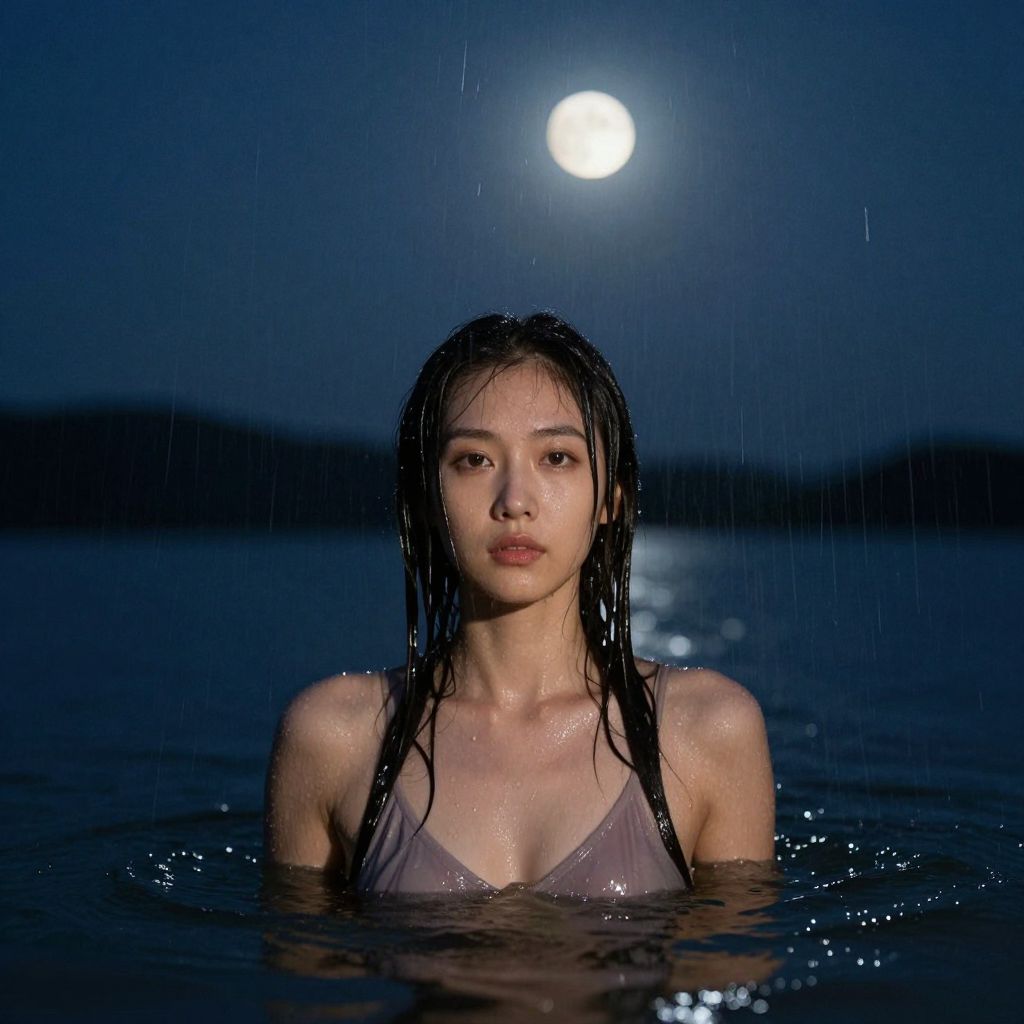 A woman stands immersed in water under a moonlit sky, her wet hair cascading around her shoulders as rain falls like liquid glass, reflecting distant lights and evoking a serene yet melancholic atmosphere.