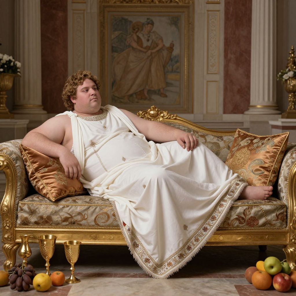 Fat toga character reclining on a luxurious couch in a Roman palace, draped in thick white fabric with ornate embroidery, surrounded by silk pillows, golden goblets, and exotic fruits, with rich warm tones and detailed classical backdrop illustrating opulence.