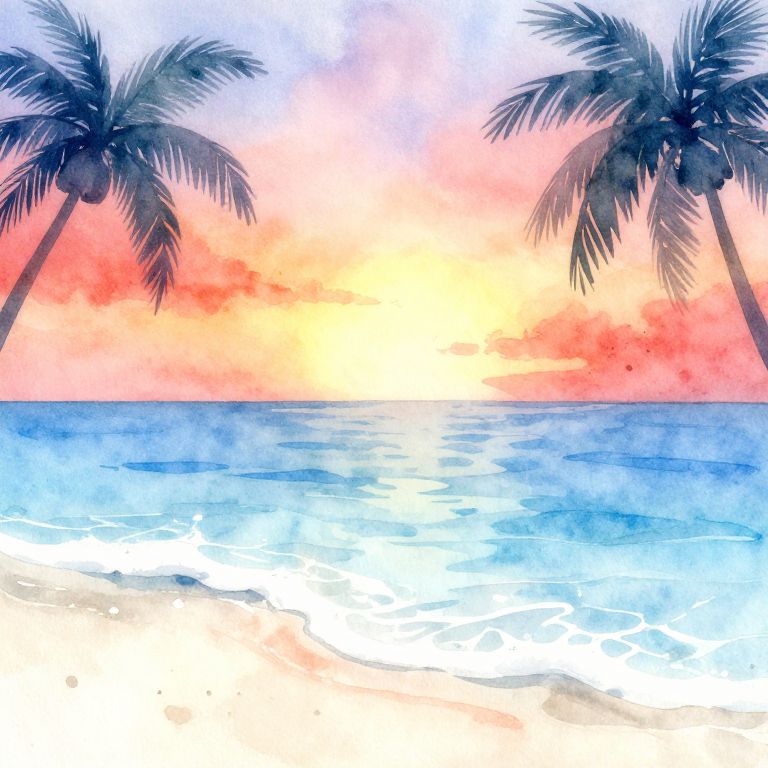 Watercolor-style painting of a serene beach at sunset, featuring two tall palm trees, a vibrant pink-orange sky, and calm blue waves reflecting sunlight.