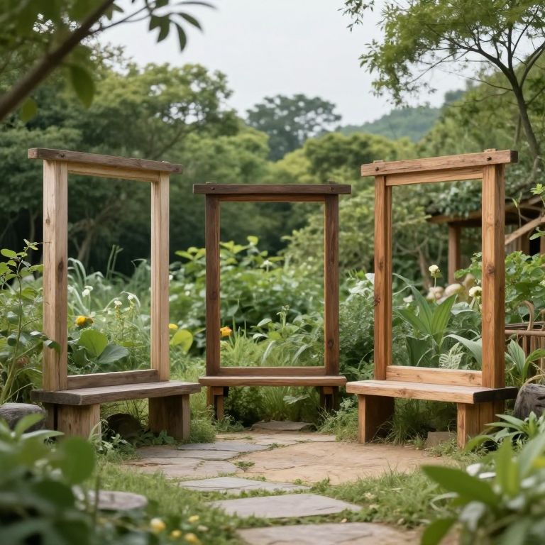 Photograph of a serene garden scene featuring three rustic wooden frames of varying sizes, standing upright on a stone pathway. The frames have a natural wood finish and are surrounded by lush green plants, tall grasses, and blooming yellow flowers. The background showcases dense, leafy trees under a partly cloudy sky. The wooden frames are positioned in a triangular formation, with the largest frame on the left, a smaller frame in the center, and the smallest frame on the right. The garden exudes a tranquil, natural ambiance.