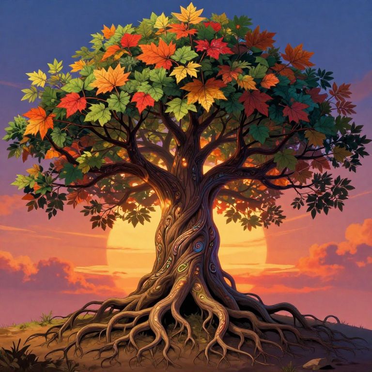 Tree of life avatar depicted as a towering spirit, roots grounded in earth, branches reaching to the sky, vibrant colors of sunset reflecting on leaves, intricate patterns in bark, fantasy concept art with rich texture and glowing highlights