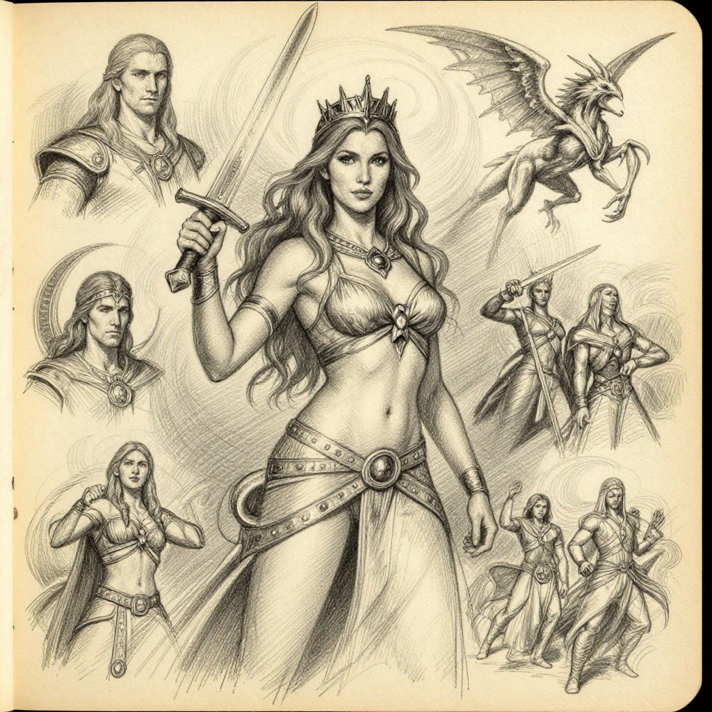 The image depicts a detailed pencil sketch on an old, yellowed page, reminiscent of classic fantasy art. The central figure is a woman with long, flowing hair adorned with a crown, holding a sword in her right hand. She is dressed in a revealing outfit with a bow and a belt, exuding a sense of power and confidence. Surrounding her are various sketches of other characters and scenes, including a man with long hair, a creature with wings, and a group of figures in dynamic poses. The background features swirling, abstract shapes, adding to the mystical and ancient atmosphere of the artwork. The overall composition is rich with intricate details, textures, and a sense of depth, creating a vivid and engaging visual narrative.