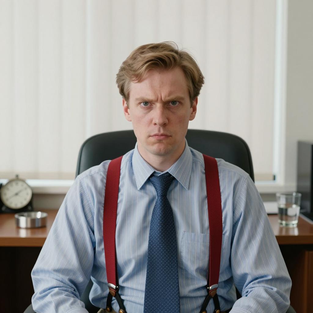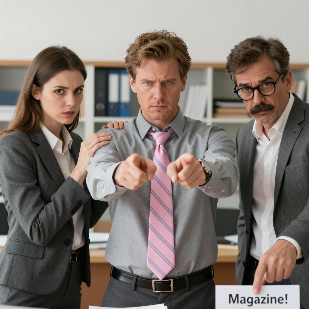 Photograph of three people in an office. Center man with brown hair, serious expression, gray shirt, pink striped tie, pointing forward with both hands. Woman on left with brown hair, gray suit, white shirt, touching his shoulder, intense expression. Man on right with brown hair, mustache, glasses, gray suit, white shirt, leaning forward, pointing at an object labeled "Magazine!" Office background with shelves and equipment.