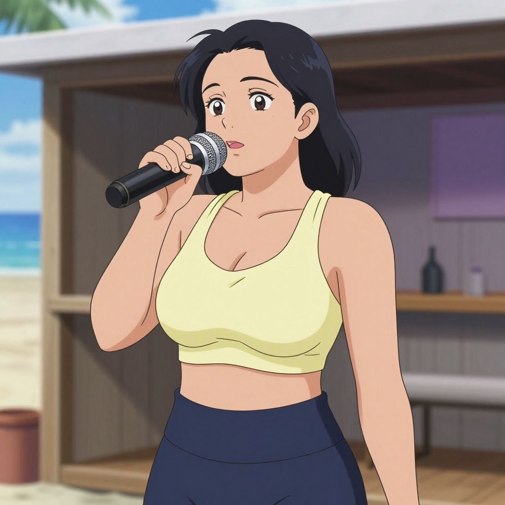 Digital anime-style drawing of a black-haired woman with fair skin, wearing a yellow sports bra and blue skirt, singing into a microphone in a beachside