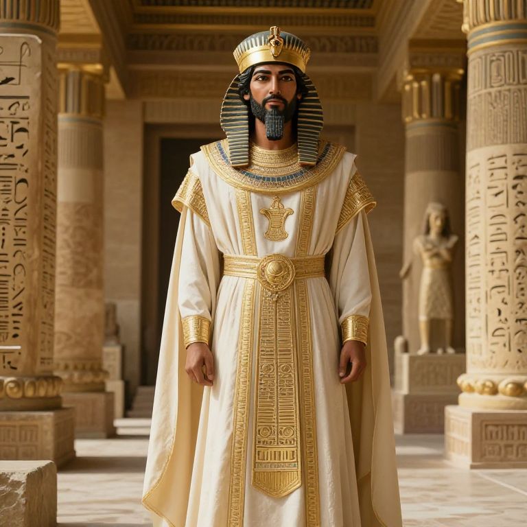 This is a digitally rendered image of an ancient Egyptian pharaoh standing in a grand temple. The pharaoh, with a dark beard and black-and-white striped nemes headdress, wears a long, white linen robe adorned with intricate gold patterns and an ornate gold waist belt. His skin tone is medium brown. The background features tall, sandstone columns with hieroglyphic carvings and a statue of another figure in the distance. The temple's architecture is characterized by warm, golden hues and detailed carvings. The pharaoh stands confidently, his expression solemn, in the center of the image, with the temple's stone floor and pillars visible around him.