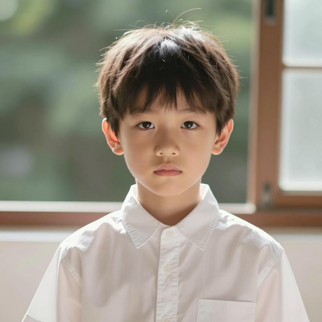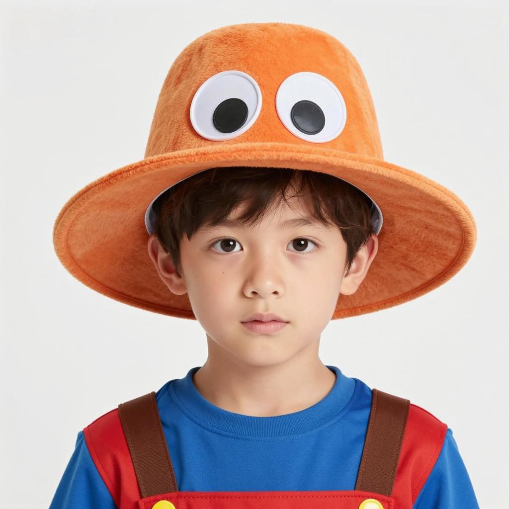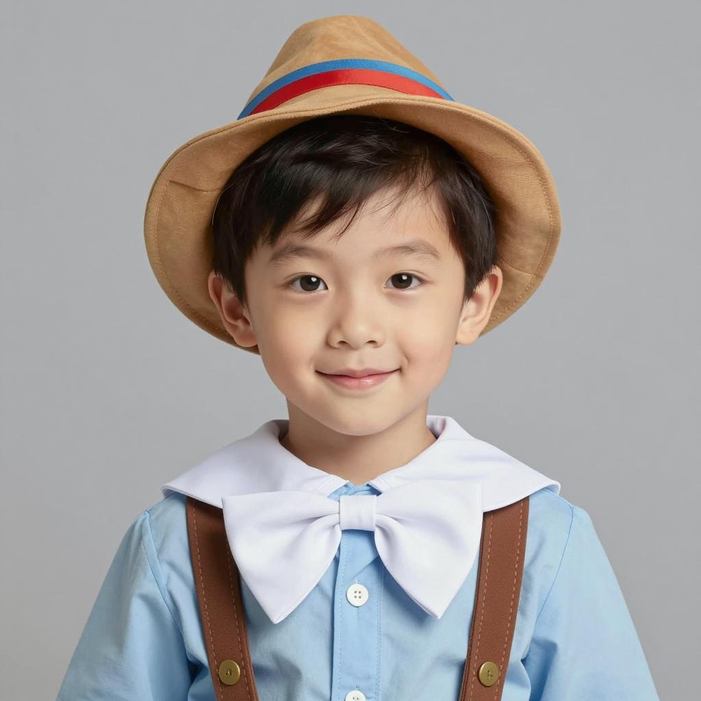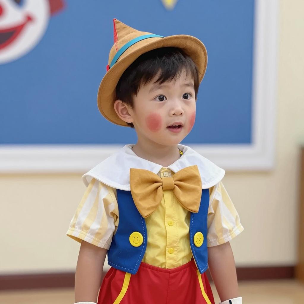 Disney pinocchio, photograph of a young boy dressed as a classic clown, standing indoors, brightly colored costume, blue overalls with yellow buttons, red and yellow striped shirt, brown bow tie, red pants, brown hat with red ribbon, wide-eyed expression, light skin, dark brown hair, wall in background with blue mural and white border, clown face painting partially visible, realistic style, daytime lighting, slightly smiling, colorful and playful atmosphere, SD/T2I realistic rendering