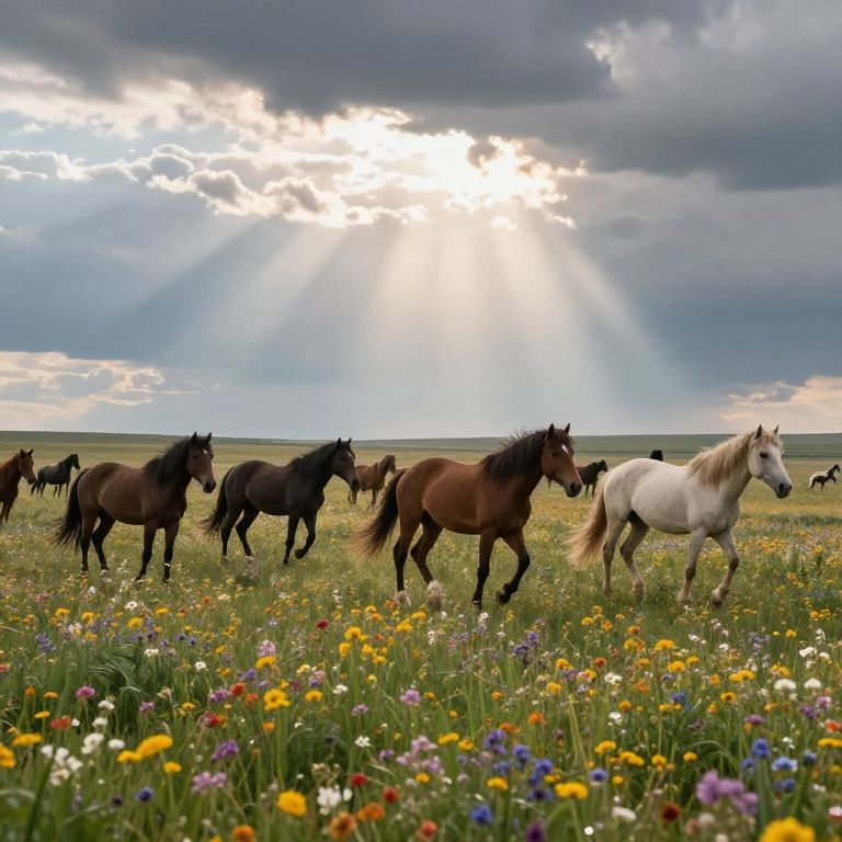 Photograph of a vibrant meadow under a dramatic sky with sun rays piercing through thick, gray clouds. A herd of horses, including brown, black, and a white one, grazes and walks through a colorful field of wildflowers—yellow, purple, white, and red. The horses are scattered across the mid-ground, with the white horse in the foreground. The background shows a flat, expansive landscape under the cloudy sky. The image has a realistic, natural style with rich colors and dynamic lighting, highlighting the beauty of both the horses and the meadow.