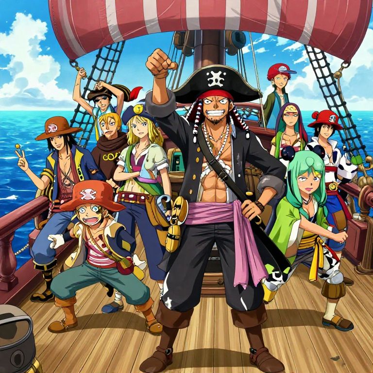 One piece crew generator concept art, vibrant anime style, diverse pirate characters with unique outfits and quirky accessories, dynamic poses on a pirate ship deck, colorful ocean background, detailed expressions, high energy, fantasy pirate adventure theme