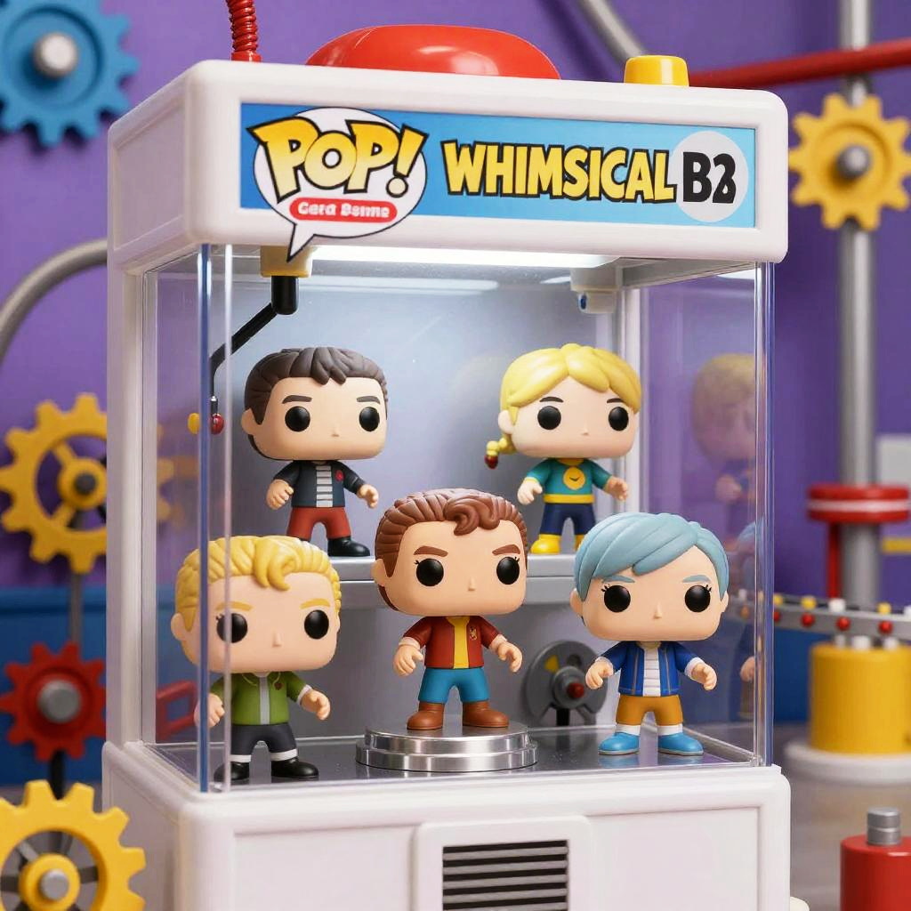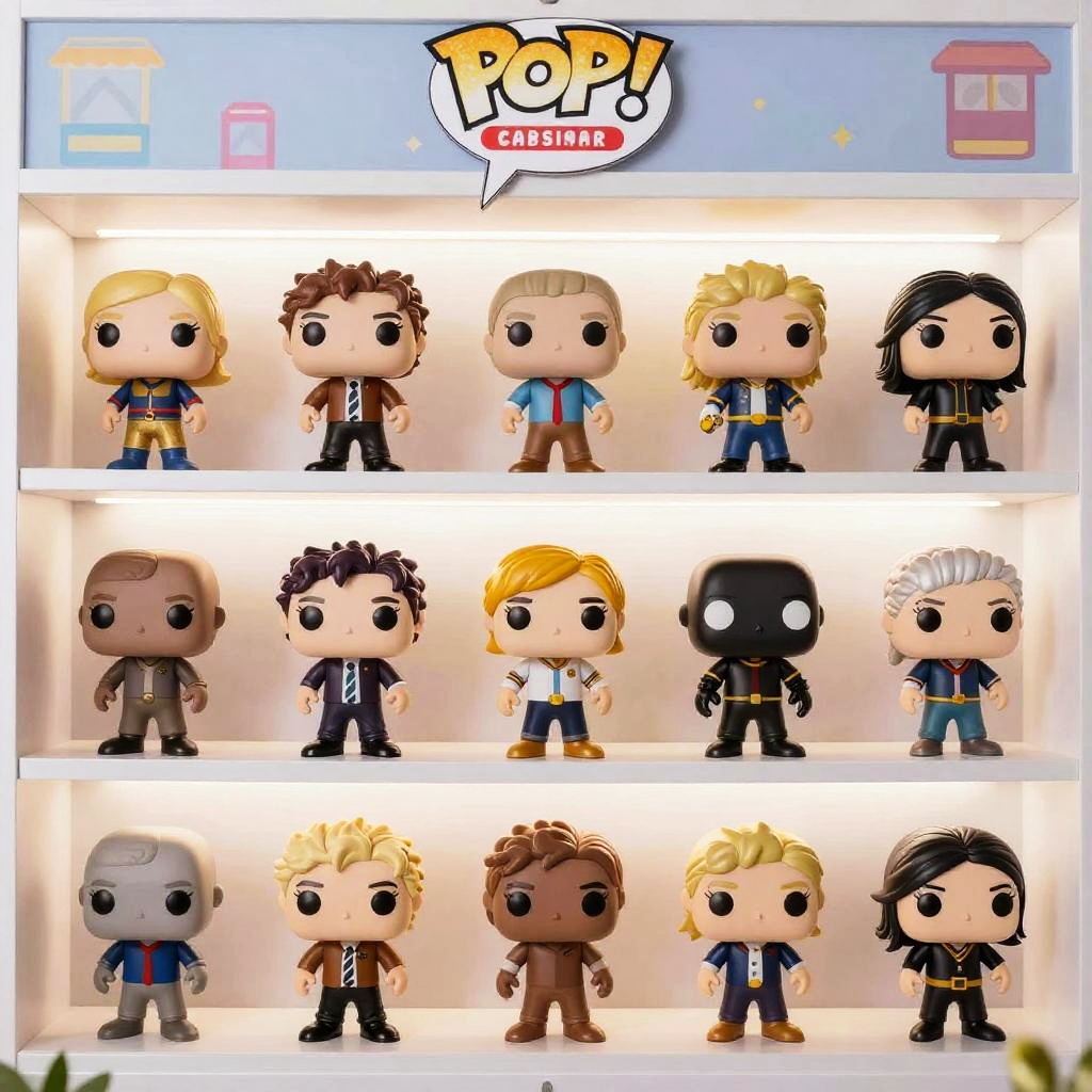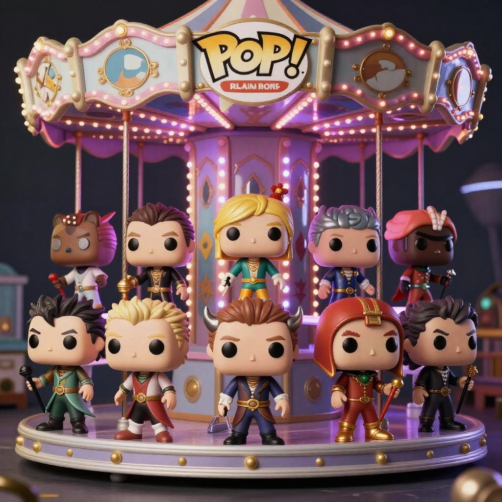 Random funko pop generator showcasing a randomized batch of custom-designed Funko Pop figurines with eclectic costumes, fantasy themes, and pop art influences, arranged on a neon-lit carousel, captured with hyper-realistic textures and dynamic composition