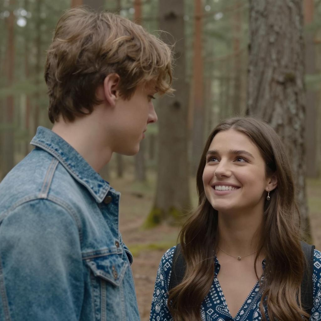 Photograph of a young woman and man with angel wings, leaning close. Woman in white tank top, necklace, brown hair. Man in silver chainmail, brown hair, intense gaze. Background crowd, blurred, one man clapping. Warm lighting, festive atmosphere.