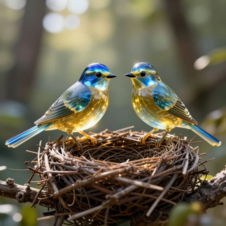 Two luminous birds, crafted from liquid glass with vibrant hues of blue and gold, perch gracefully on a rustic nest, refracting sunlight into prismatic splendor against a softly blurred forest backdrop, evoking a magical, high-definition digital art aesthetic.