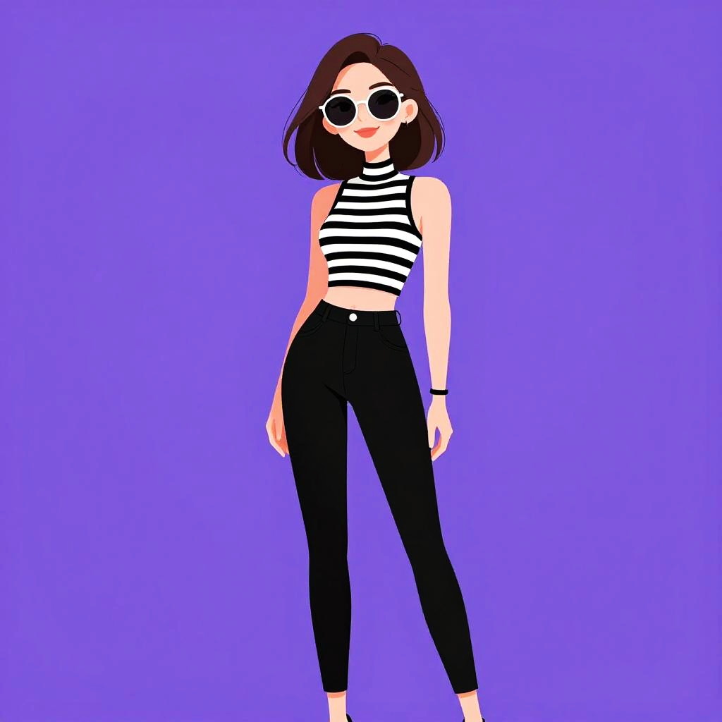 Digital illustration of a stylish woman with short brown hair, black tank top, dark red jeans, black sunglasses, hoop earrings, and a belt with a