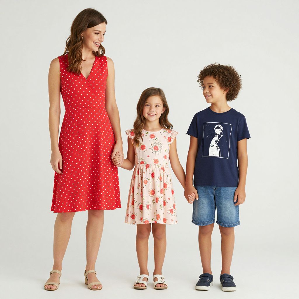 Family leisurewear collection featuring three individuals—a woman in a red polka-dot dress, a young girl in a floral pink dress, and a boy in a navy graphic T-shirt and denim shorts—holding hands and smiling against a clean, minimalist backdrop.