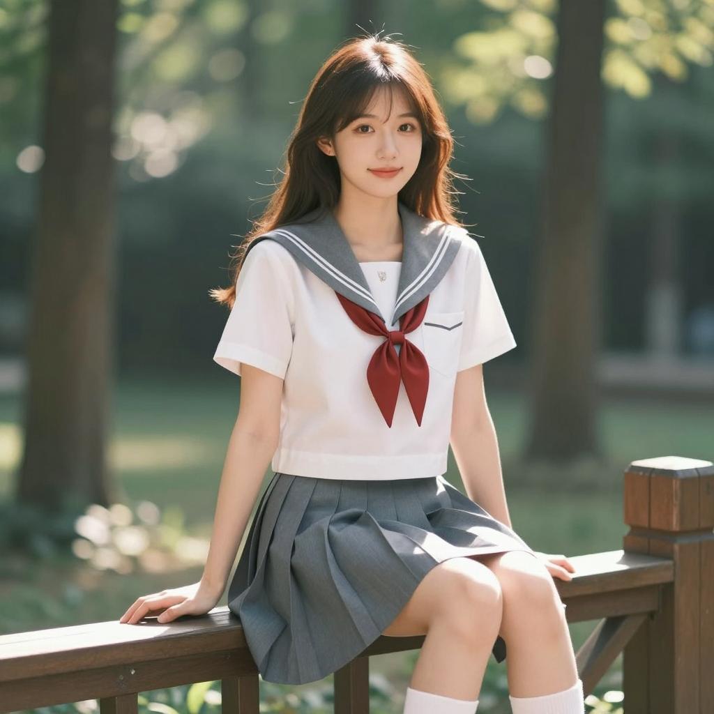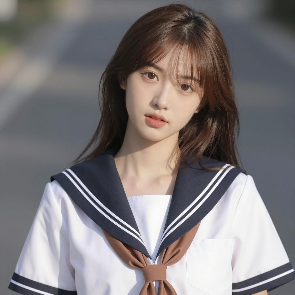 Asian girl with long brown hair, wearing a white and navy sailor school uniform with a purple necktie. She looks slightly to the side with a soft expression. Background includes a blurred path and greenery. Light sun highlights her hair. She stands with her body slightly tilted and arms relaxed by her sides.