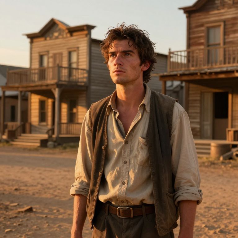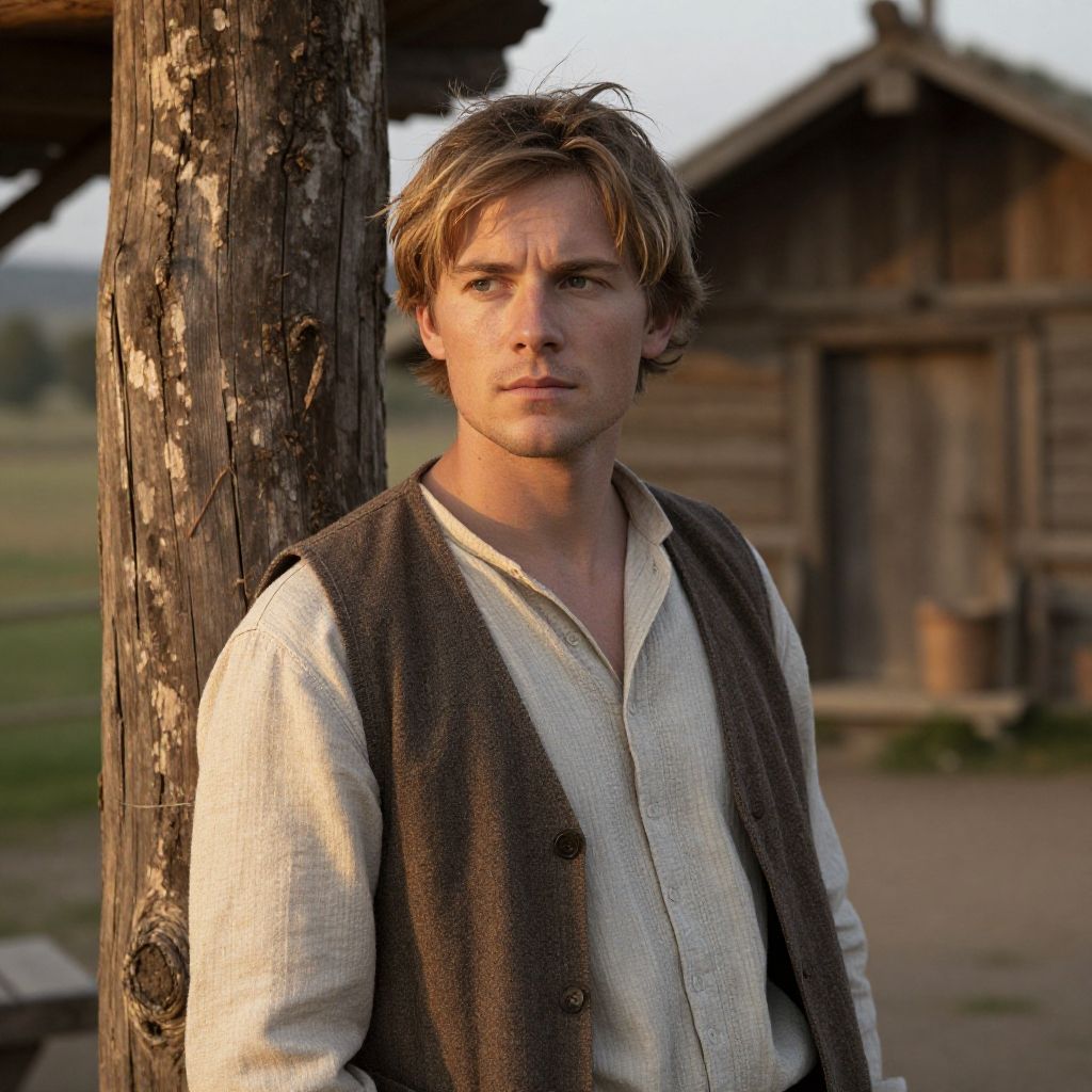 Photograph of a Caucasian man with light brown, slightly messy hair, wearing a beige, long-sleeved shirt with a buttoned-up front, and a dark brown, textured vest. He stands leaning against a weathered wooden post, with a rustic wooden cabin in the background. The cabin has a slanted roof and is set in a grassy, open field. The man has a serious expression, and the lighting suggests late afternoon, casting warm, soft shadows. His skin is fair, and he is clean-shaven. The image has a natural, historical feel.