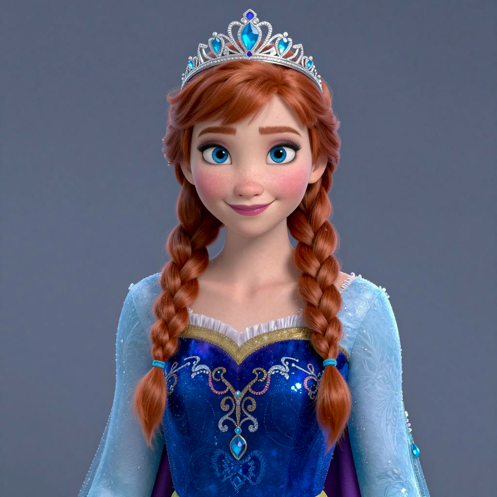 Digital illustration of a fair-skinned woman with long blonde hair wearing a sheer, sparkling, light blue dress with long sleeves. She stands in a turquoise, icy background with snowflakes. She has a calm expression, earrings, and slightly parted lips. She extends her right hand slightly forward. The background has arched patterns and sparkling stars. The number of people is one. The visual style is realistic with fantasy elements.