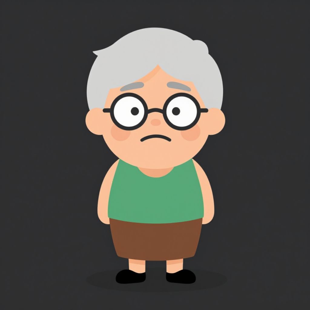Cartoon elderly man with white hair, round glasses, green sleeveless shirt, brown skirt, black shoes, and sad expression against dark background.