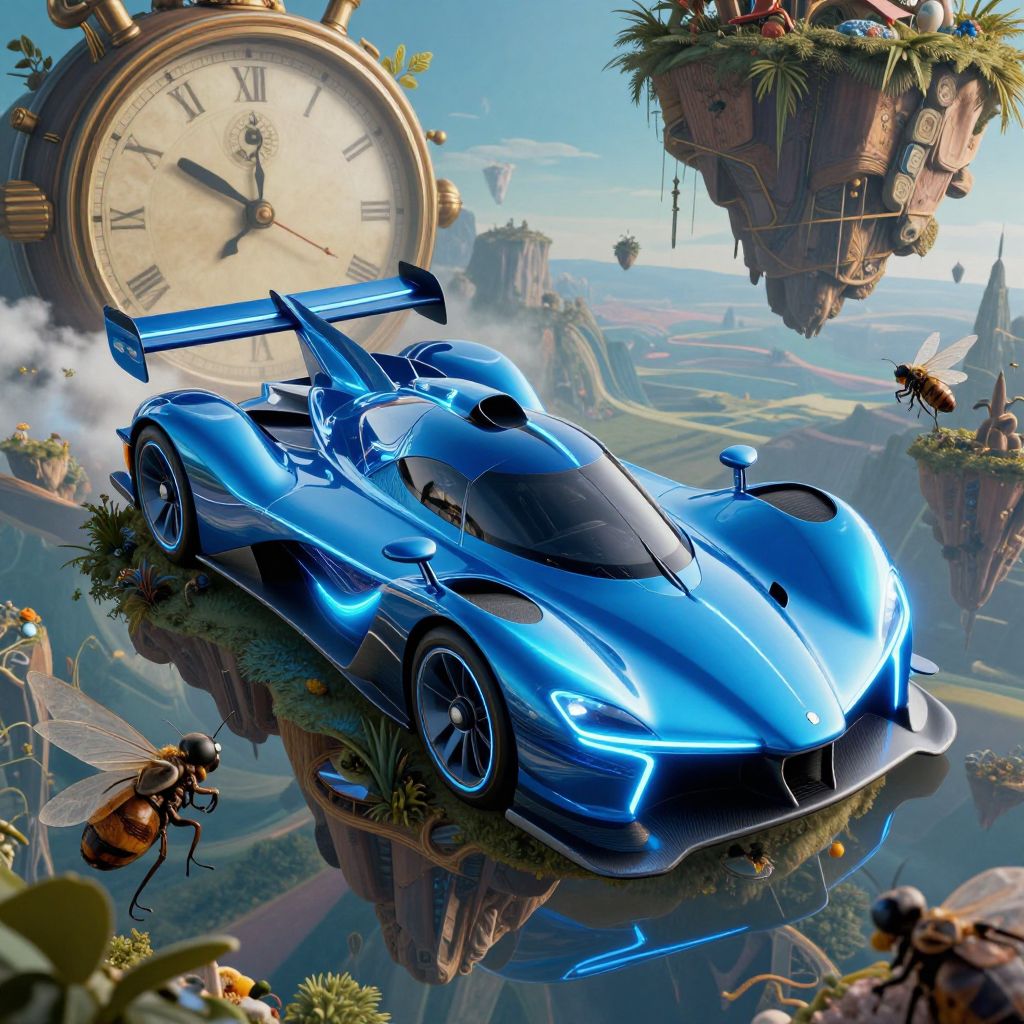 This digital artwork depicts a sleek, blue, high-performance sports car with a large rear spoiler, hovering above a surreal, fantasy landscape. The car's glossy surface reflects light, emphasizing its aerodynamic design. Surrounding the car are floating clock islands with Roman numerals, lush greenery, and tiny insects, including bees and ants. The background features a dreamy, colorful landscape with rolling hills and a distant horizon. The car is positioned centrally, with the clock island and clock hands visible in the upper left, and insects in the foreground and lower right. The overall style is vibrant and fantastical, blending elements of realism with imaginative, whimsical features.