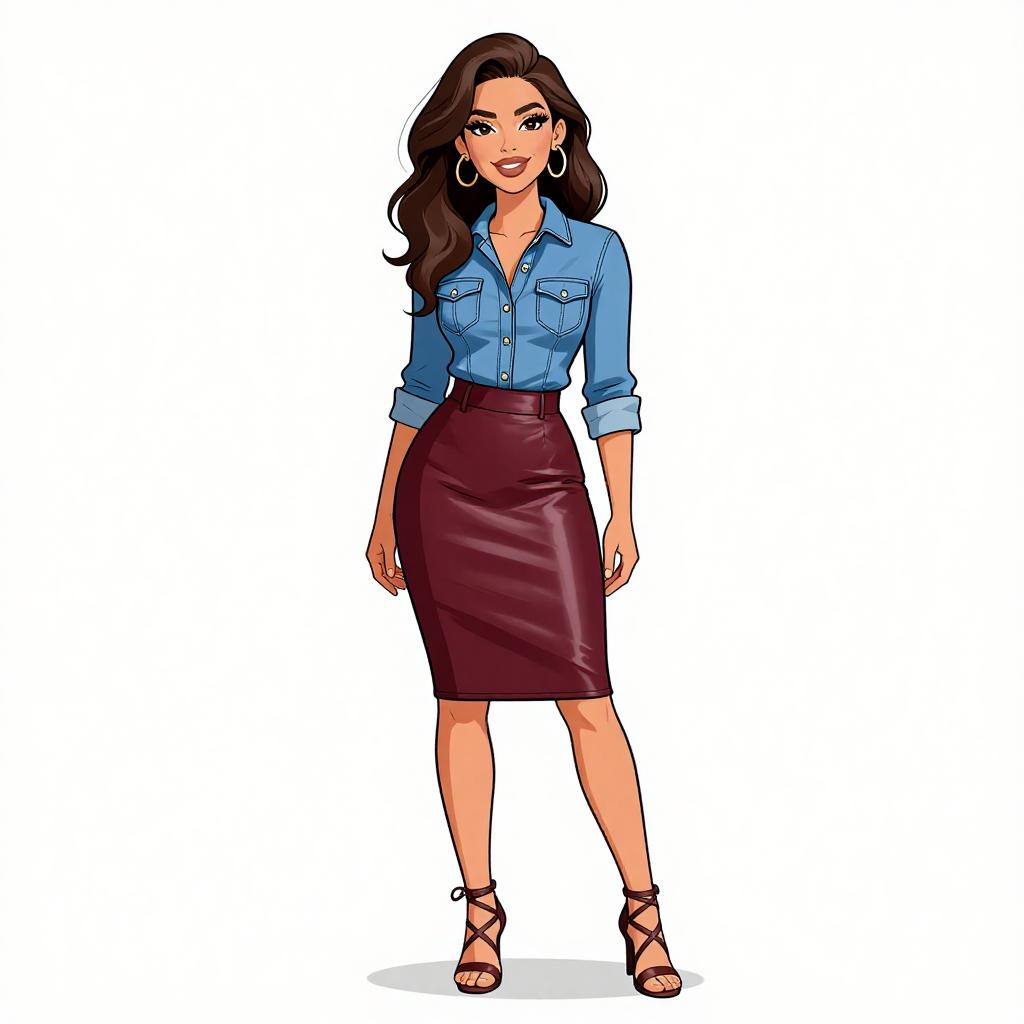Woman with pretty face and pretty hair. smiling Woman, edgy chic, black leather skinny pants, fitted black jacket with asymmetrical gold zipper, dark red textured top under jacket, peep-toe black ankle boots with high heels, white studio background. --sref 1467