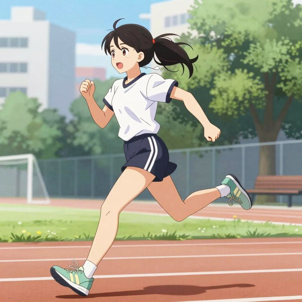 Anime bloomers on a sporty girl running through an urban schoolyard, dynamic motion blur, energetic expression, colorful background, sharp line art with vibrant highlights