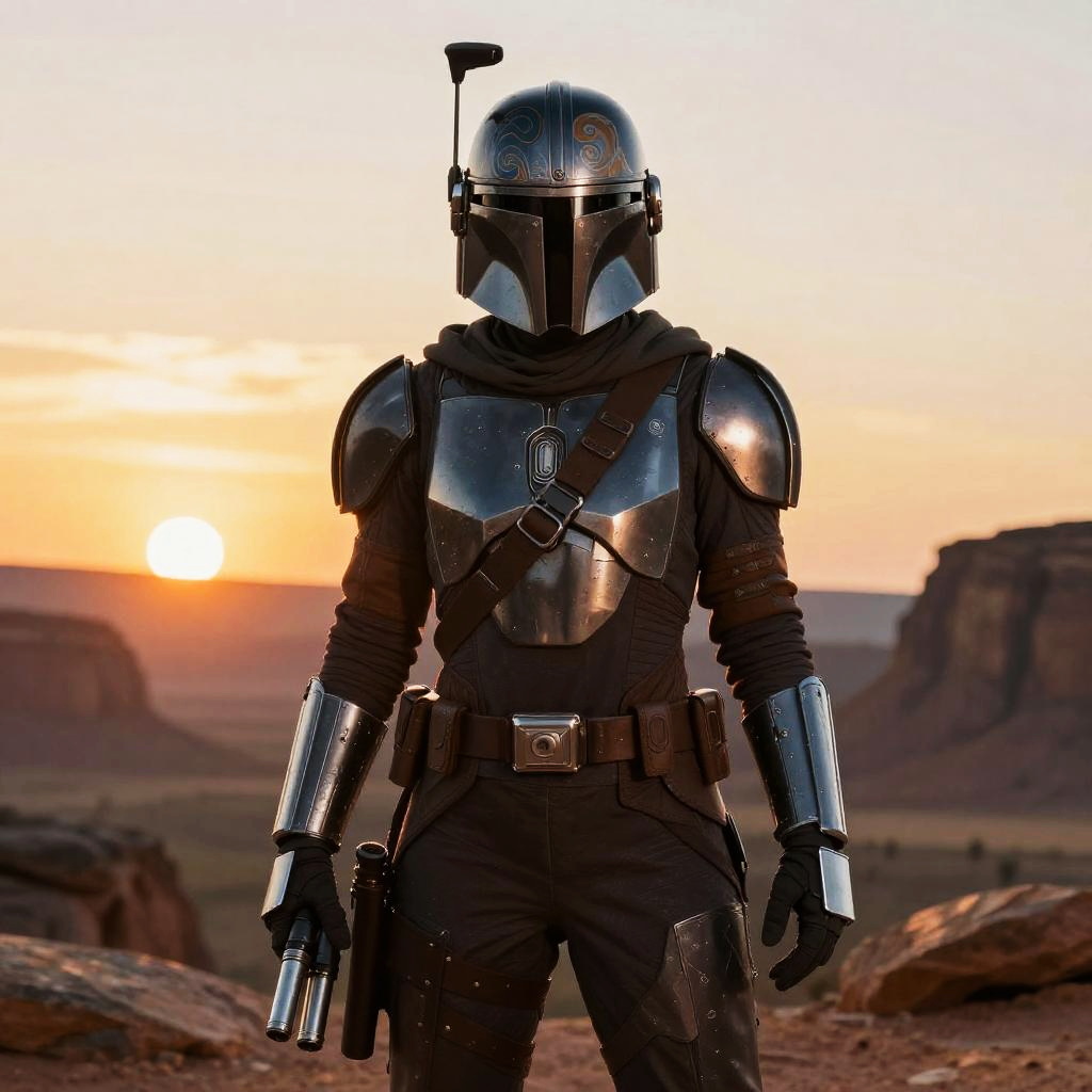 Female Mandalorian armor designs, sleek high-tech armor with intricate engravings, helmet with T-shaped visor, standing on rugged terrain, dynamic pose, sharp shadows