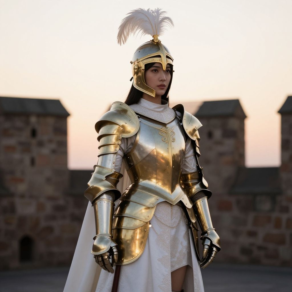 Female knight outfit, elegant white and gold plate armor, ornate helmet with feather plume, standing on castle battlements at sunset, soft light highlighting details