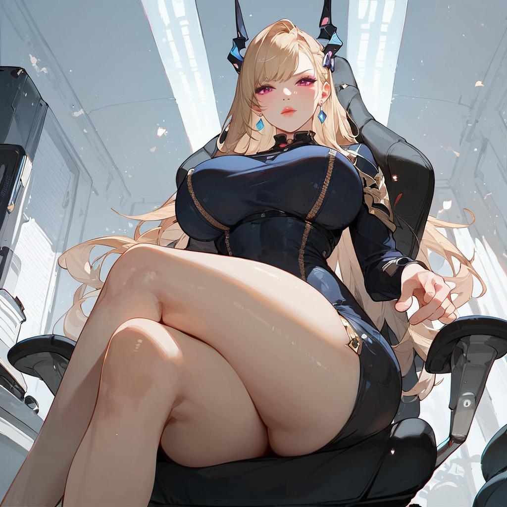 Score_9, score_8_up, score_7_up, source_anime, masterpiece, best quality, highly detailed, Expressiveh, Woman, crossed legs, Low Angle View, Office Chair, skintight bodysuit, darkness, Silhouette, looking tsundere at Viewer, Neon DARK colorful, translucent Planets in Infinity galaxy Background