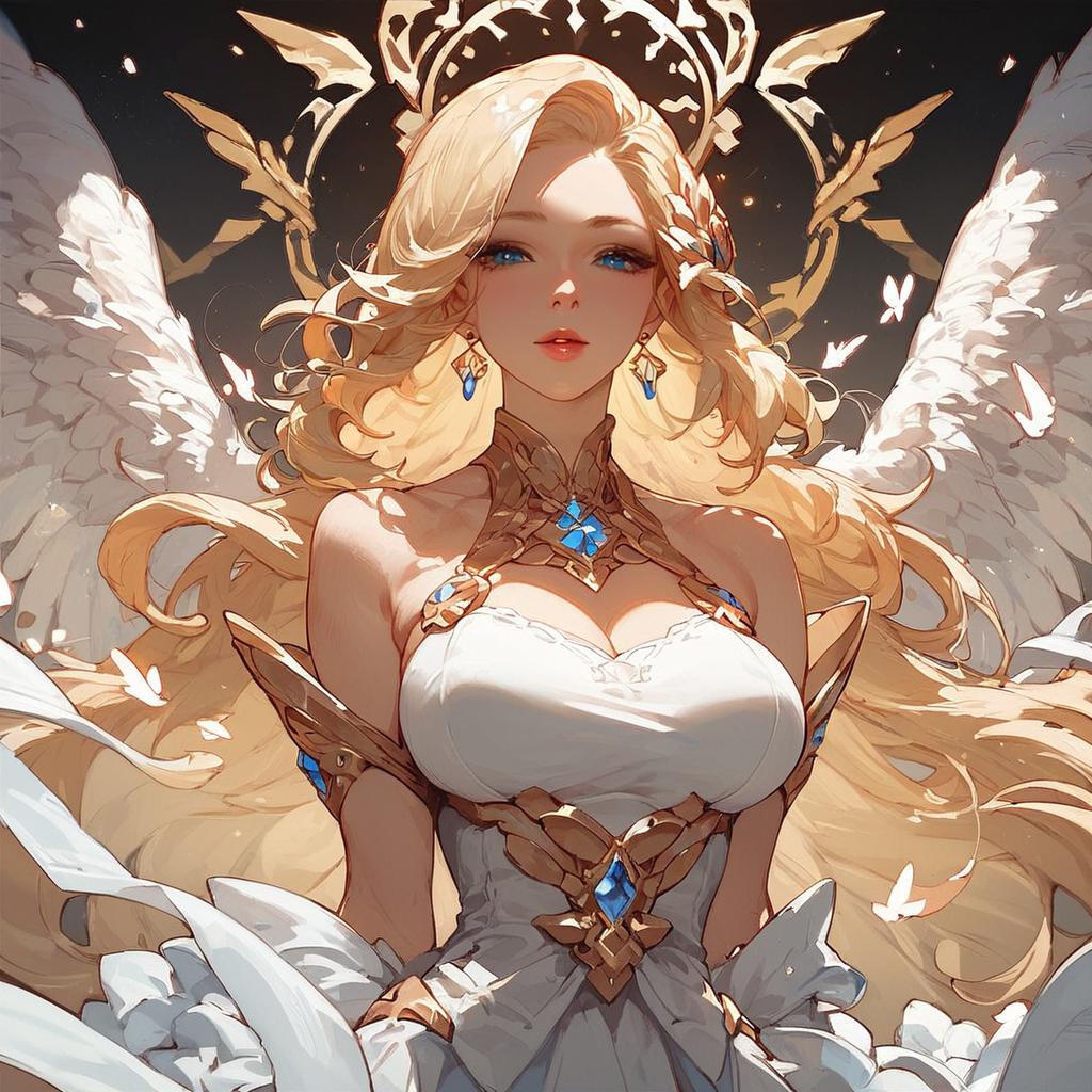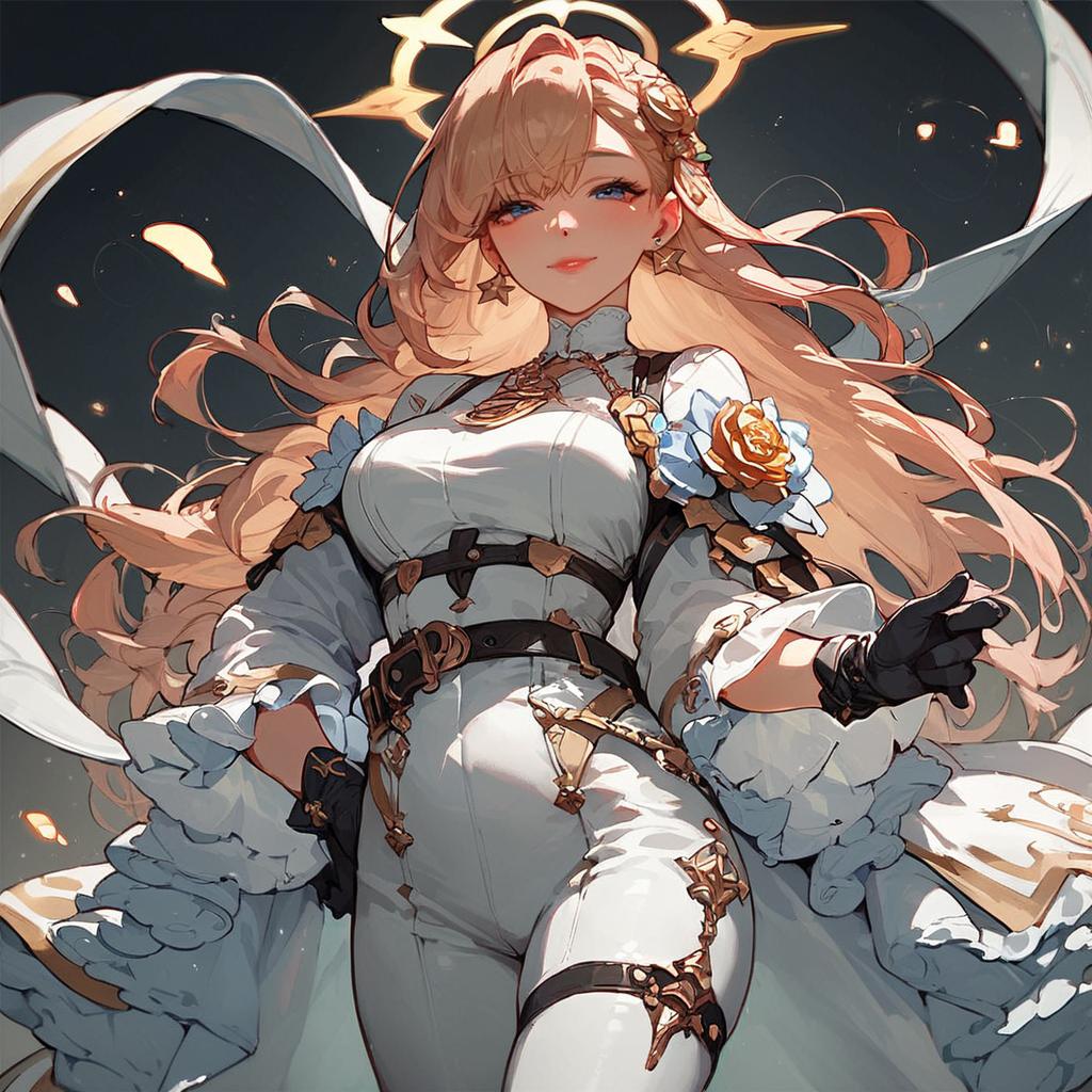 Score_9, score_8_up, score_7_up, source_anime, solo, 1girl, strivejacko, smile, looking at viewer, standing, compass rose halo, white bodysuit, black gloves, belt, ankh, necklace
