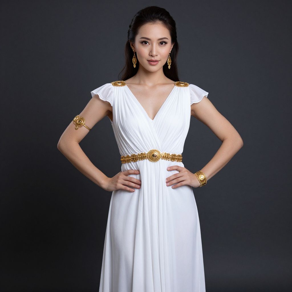 Photograph of an Asian woman with long black hair, standing against a dark gray background. She wears a flowing white gown with short sleeves and a deep V-neck, adorned with gold embellishments on the shoulders and a wide gold belt with a central gemstone. She also has gold earrings, a matching armband on her left arm, and a gold bracelet on her right wrist. Her hands rest on her hips, and she gazes directly at the camera with a confident expression. The lighting highlights her smooth skin and the texture of the fabric.